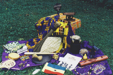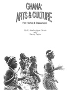 The Chest is presented in an attractive kente covered box along with a copy of GHANA: ARTS & CULTURE FOR HOME & CLASSROOM with simple instructions for making and/or using the above objects with descriptions of their history and symbolism, an audio tape teaching pronunciation and melodies of game songs and instructions on basic Ghanaian rhythms and a video demonstrating Adowa and Highlife dance steps and headwraps for women. |